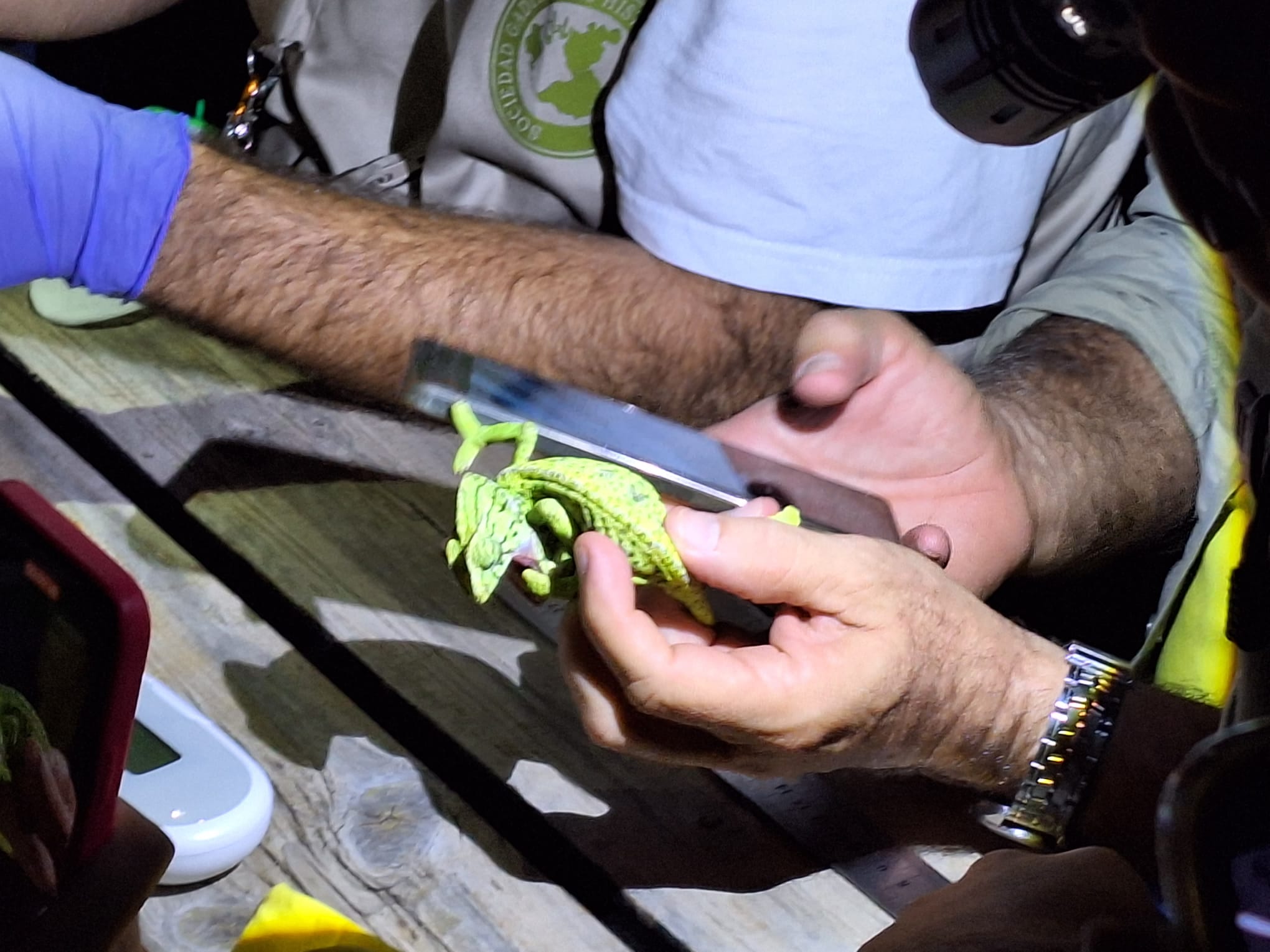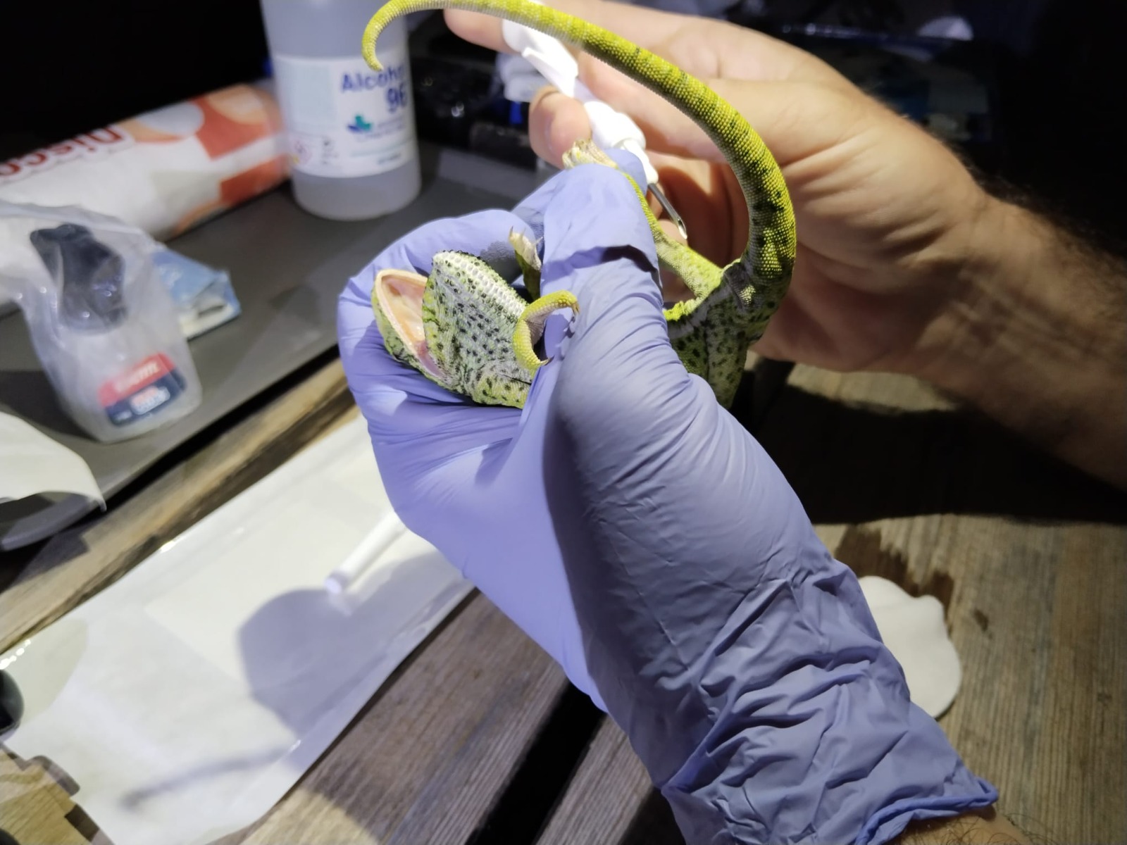 - Marcaje con microchip: A uno de los camaleones se le implantó un microchip intradérmico, un sistema de identificación permanente que permite su seguimiento a largo plazo.